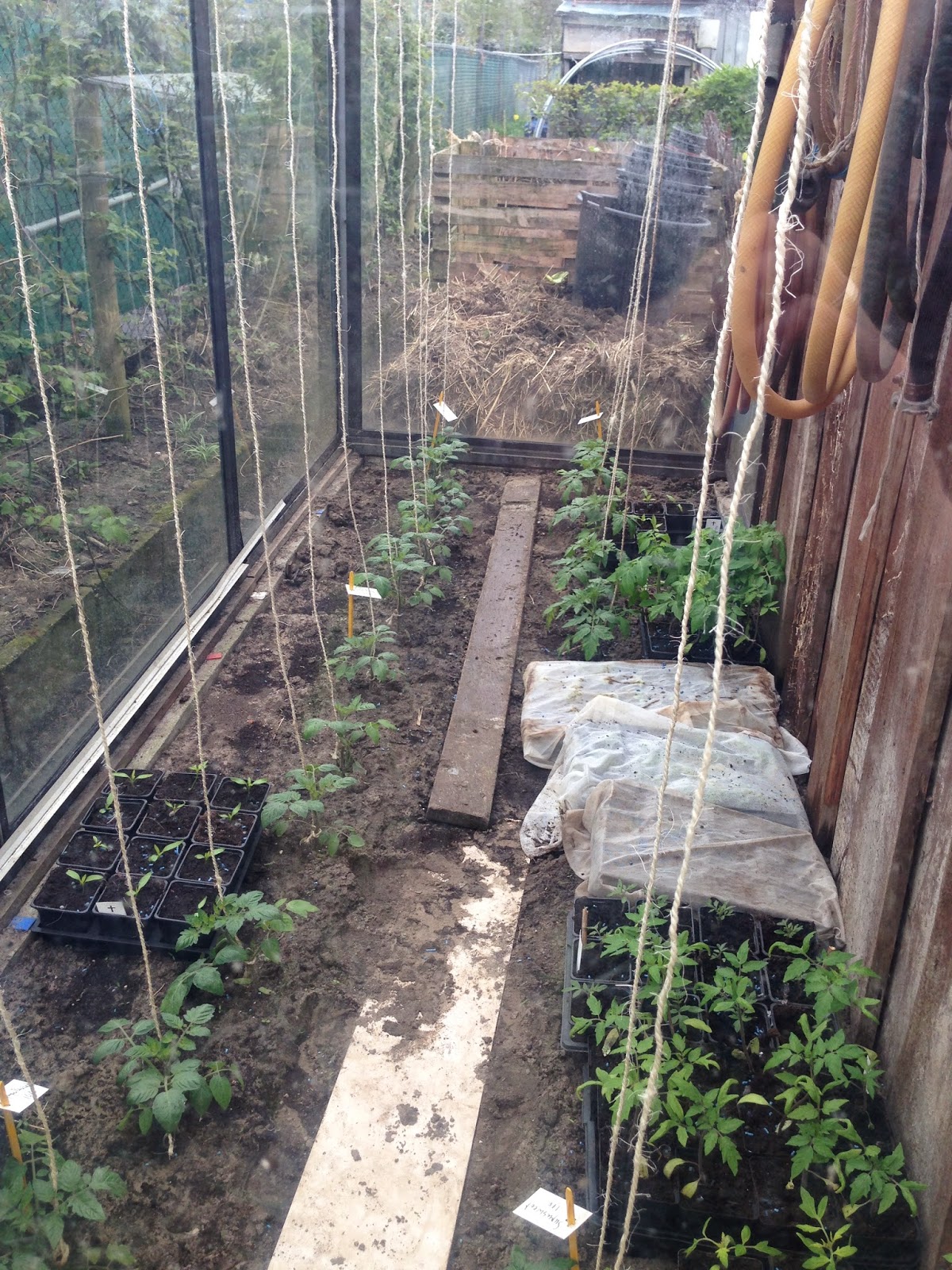 In het kasje achteraan hangen touwtjes geduldig te wachten totdat de tomaten- en paprikaplantjes gaan klimmen.